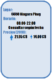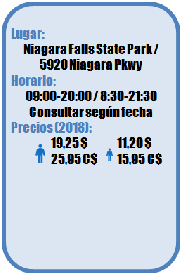 - Entrada Ultimate Combo: permite dos accesos a la plataforma de observación, uno durante el día y otro durante la noche, y la visualización de la película en 4D Falls Legends of Niagara Falls.