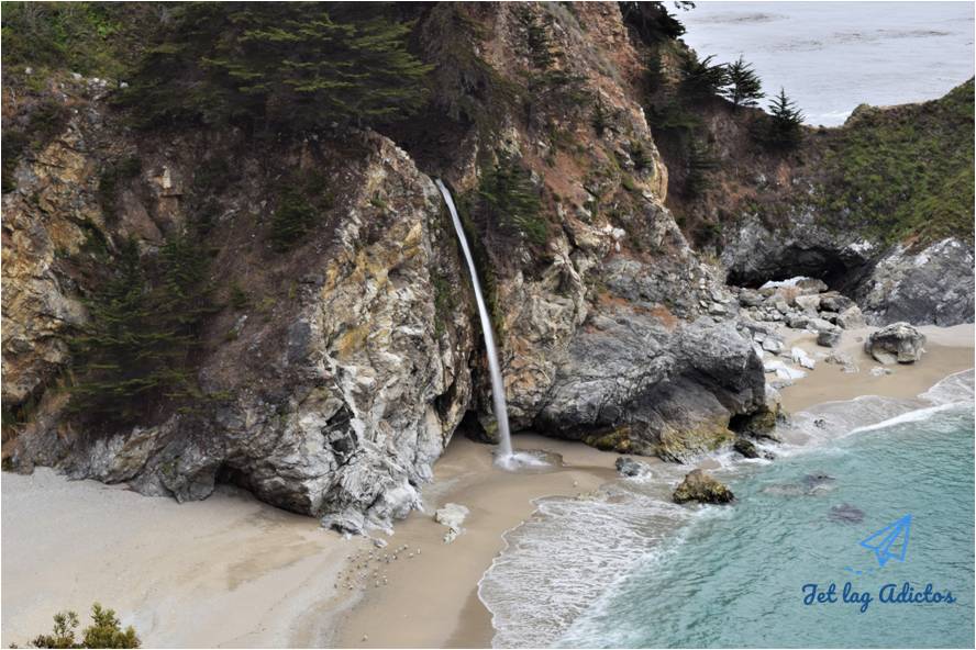 Después de conducir casi otros 40 Km y de realizar una parada para comer en uno de los restaurantes que encontramos por la carretera, llegamos a uno de los parques estatales de la zona, el Julia Pfeiffer Burns State Park, donde paramos a contemplar el icono del Big Sur, la cascada de McWay, donde el agua caía en picado sobre la playa desde una altura de 24 metros por acantilados de granito.