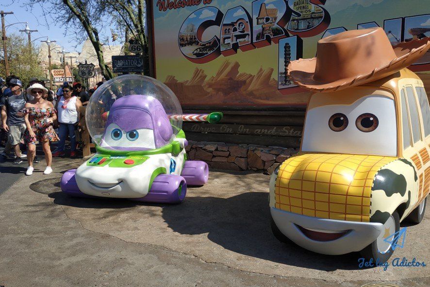 Seguidamente, seleccionamos un Fast Pass para Radiator Springs Racers y, mientras esperábamos a que se activase, nos desplazamos a la zona de Cars Land y nos dirigimos a uno de los fotógrafos de la zona para que nos tomase fotos divertidas con algunos de los personajes de la película Cars. También disfrutamos de la ambientación exquisita del área: caminamos por la carretera original de Radiador Springs y recorrimos los negocios regentados por los coches de la película como, por ejemplo, la Tienda de Aceite Orgánico de Fillmore, la Cabaña Militar de Sargento, el Café V8 de Flo, el Motel Cono Comod-Inn o la Casa de la Rueda de Luigi.
