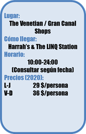Ningún viaje a Venecia o a The Venetian estaría completo sin un romántico paseo por el Gran Canal en una auténtica góndola veneciana.